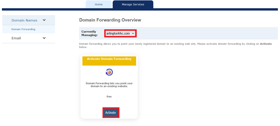 4. Select the proper domain name from the Currently Managing: drop-down menu and click on the Activate button.
