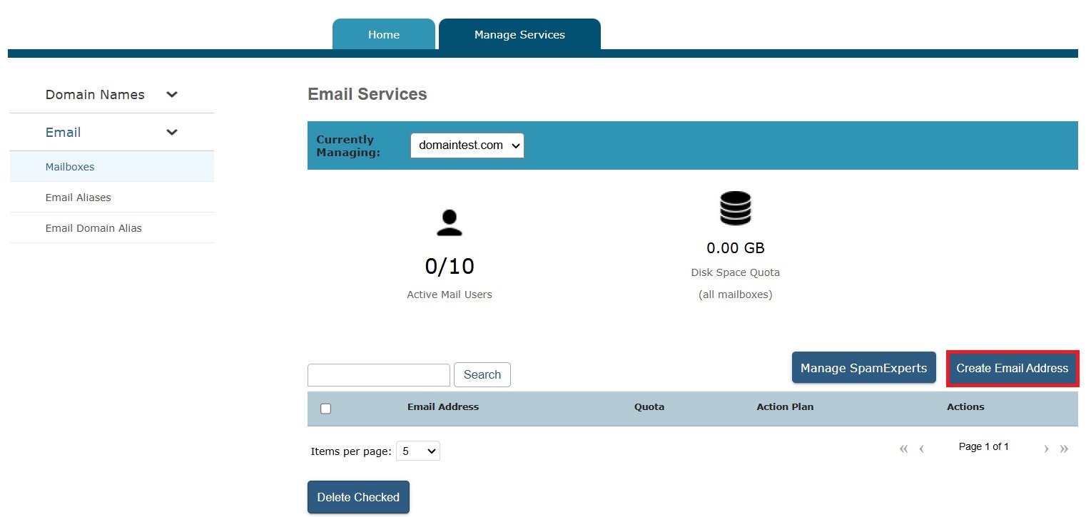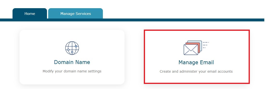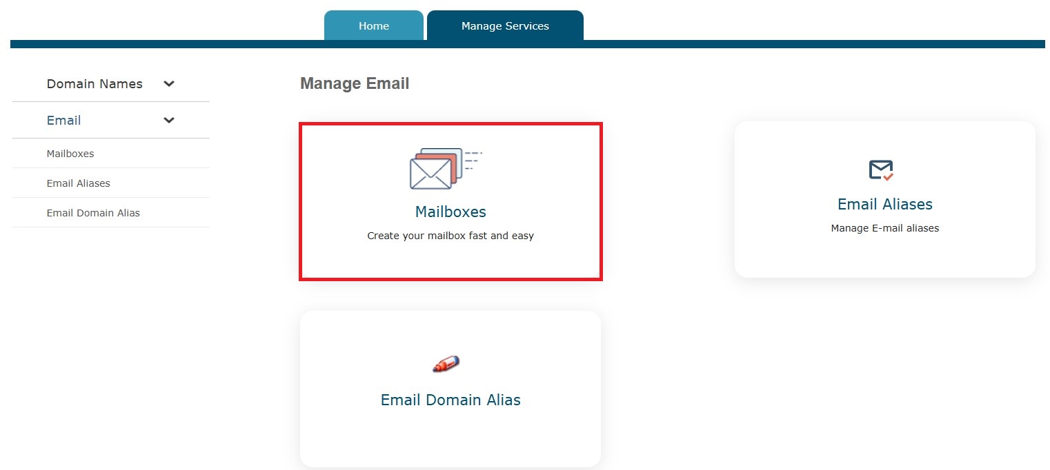 2. Click the Manage Email menu, available on the Home page, and open the Mailboxes menu.