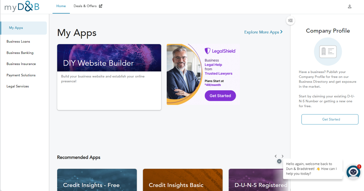 1. Log in to your Dun & Bradstreet control panel, go to Home > My Apps, and click on the tile containing your active service to reach our SiteControl.